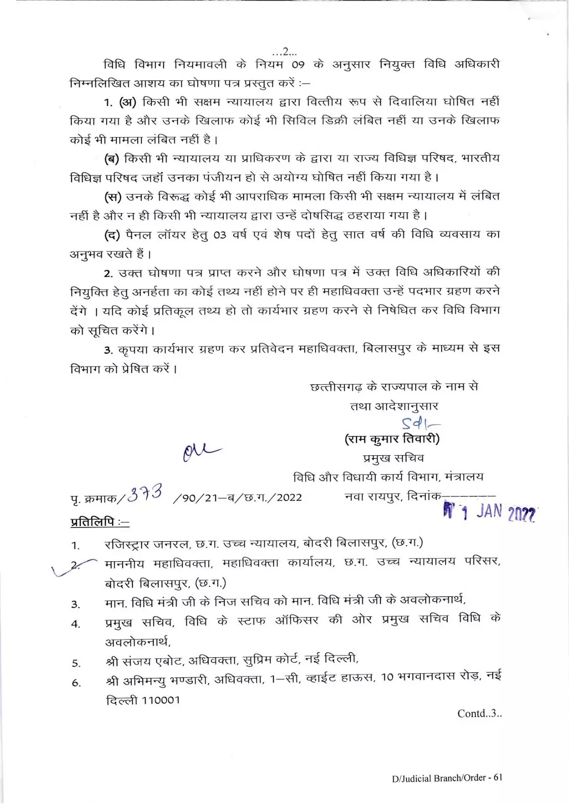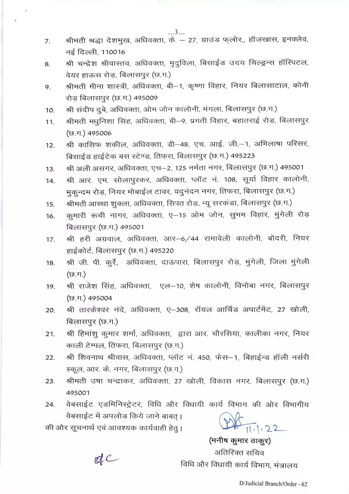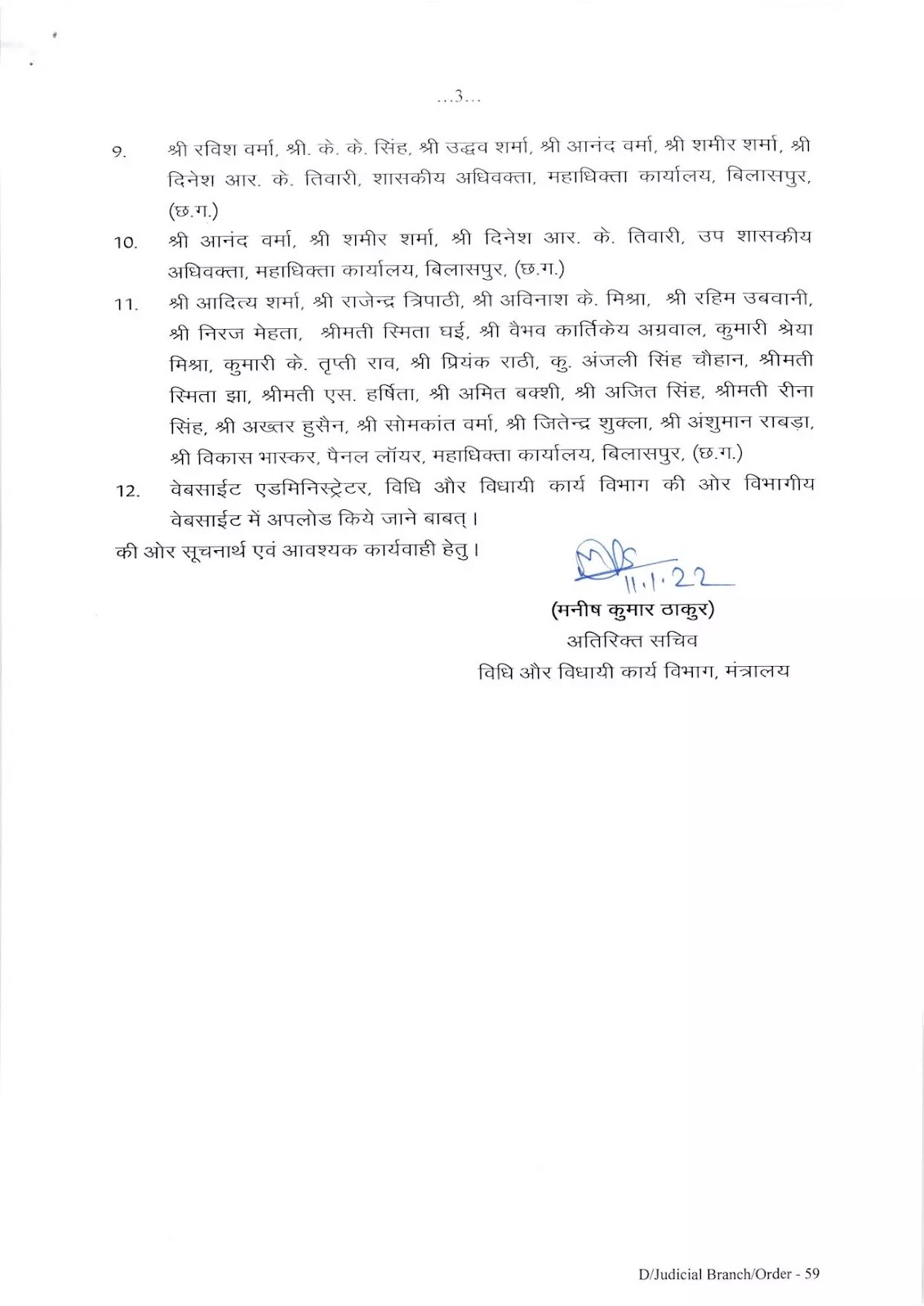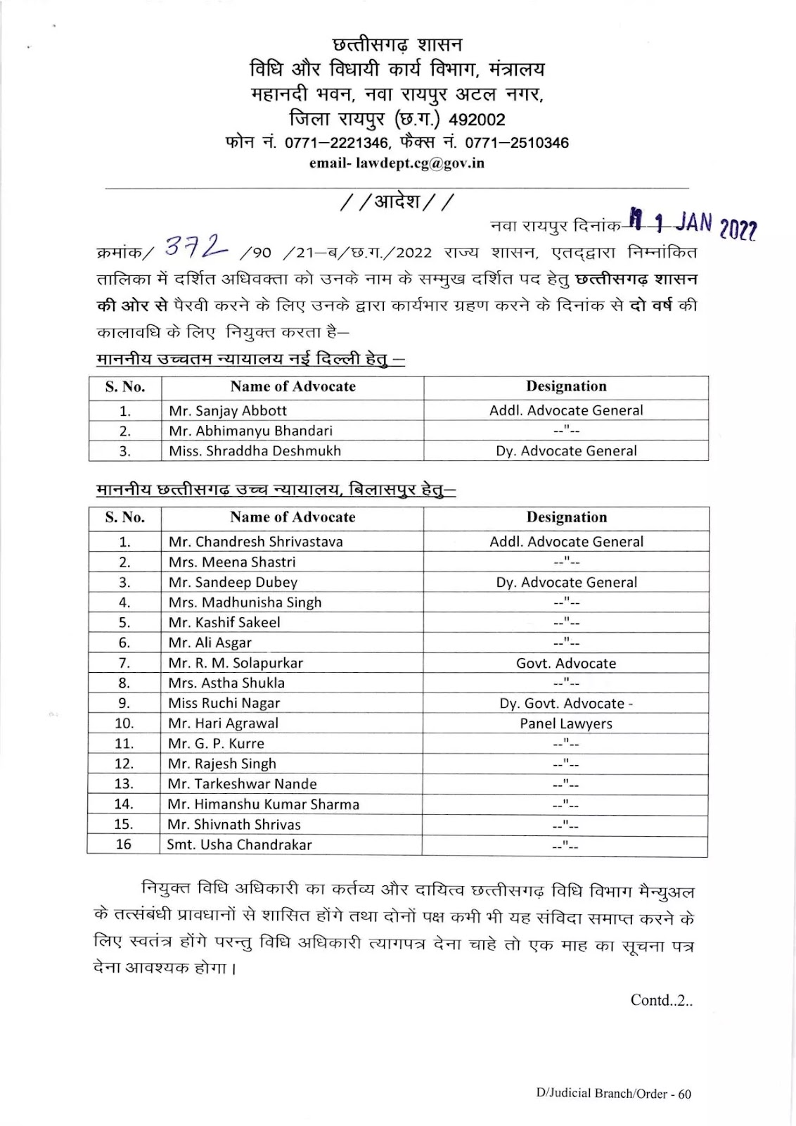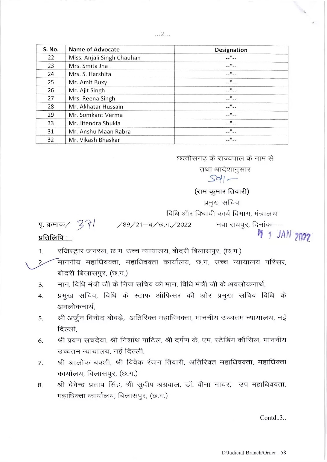 रायपुर । छत्तीसगढ़ शासन विधि एवं विधायी कार्य विभाग द्वारा आज सुप्रीम कोर्ट के 4 स्टैंडिंग काउन्सिल और छत्तीसगढ़ हाई कोर्ट के 32 शासकीय अधिवक्ताओ की सेवाएं समाप्त करने का आदेश जारी किया हैं। और उनके स्थान पर छत्तीसगढ़ हाईकोर्ट में 16 नए शासकीय अधिवक्ताओ की नियुक्ति की गई हैं। विधि एवं विधायी कार्य विभाग ,छत्तीसगढ़ शासन द्वारा जारी आदेश निम्नानुसार विधि अधिकारीयों की नियुक्ति की गई है –