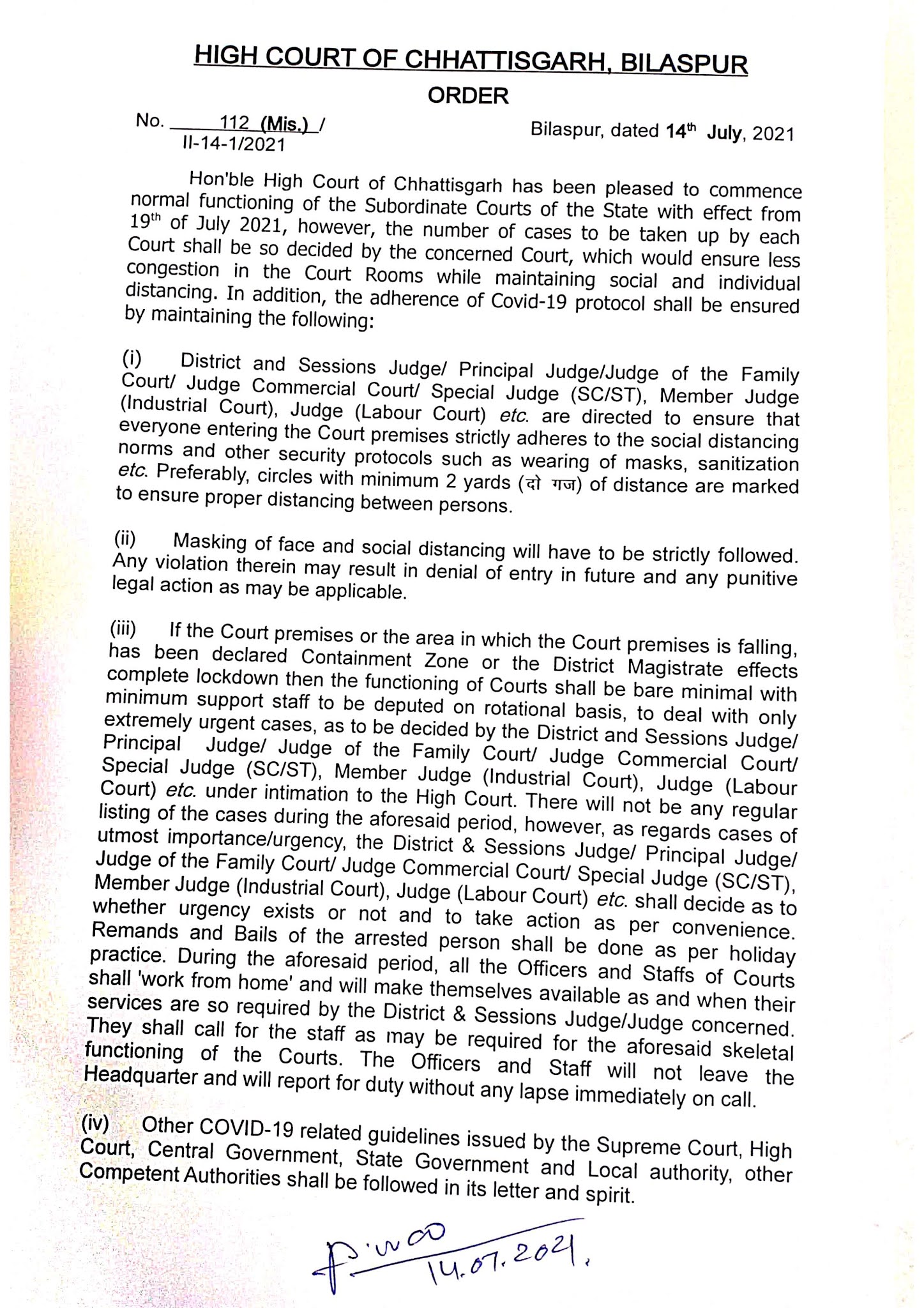 न्यायालय परिसर या क्षेत्र को कन्टेनेंमेंट जॉन घोषित किए जाने की स्थिति में कामकाज रोटेशनल आधार पर व न्यूनतम स्टाफ के साथ होगा। और इस अवधि में अन्य कर्मचारियों द्वारा वर्क फ्रॉम होम प्रणाली का अनुसरण किया जाएगा। इस दौरान केवल अत्यावश्यक मामले या संबंधित न्यायालय द्वारा तय किए गए मामलों पर ही सुनवाई होगी।