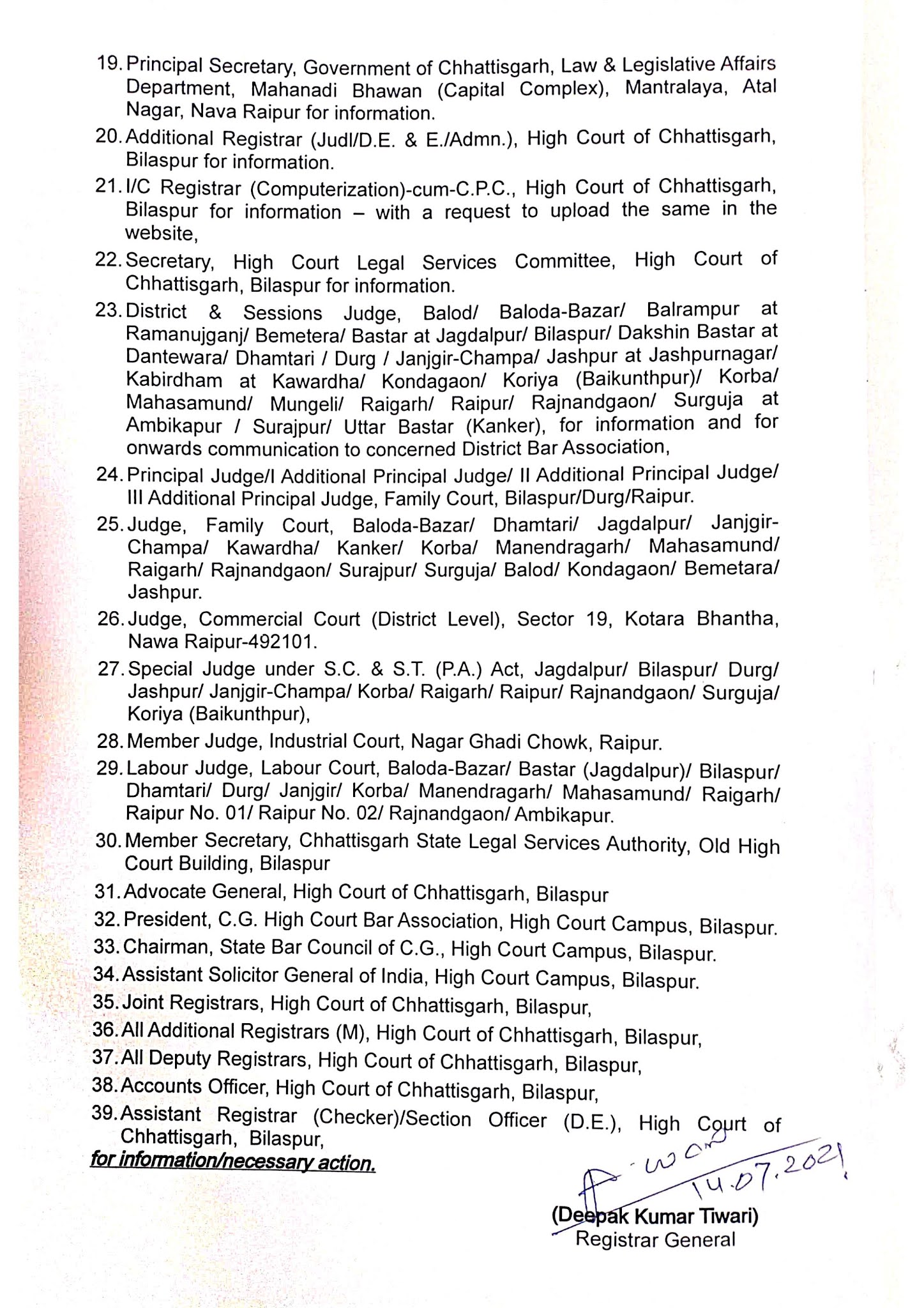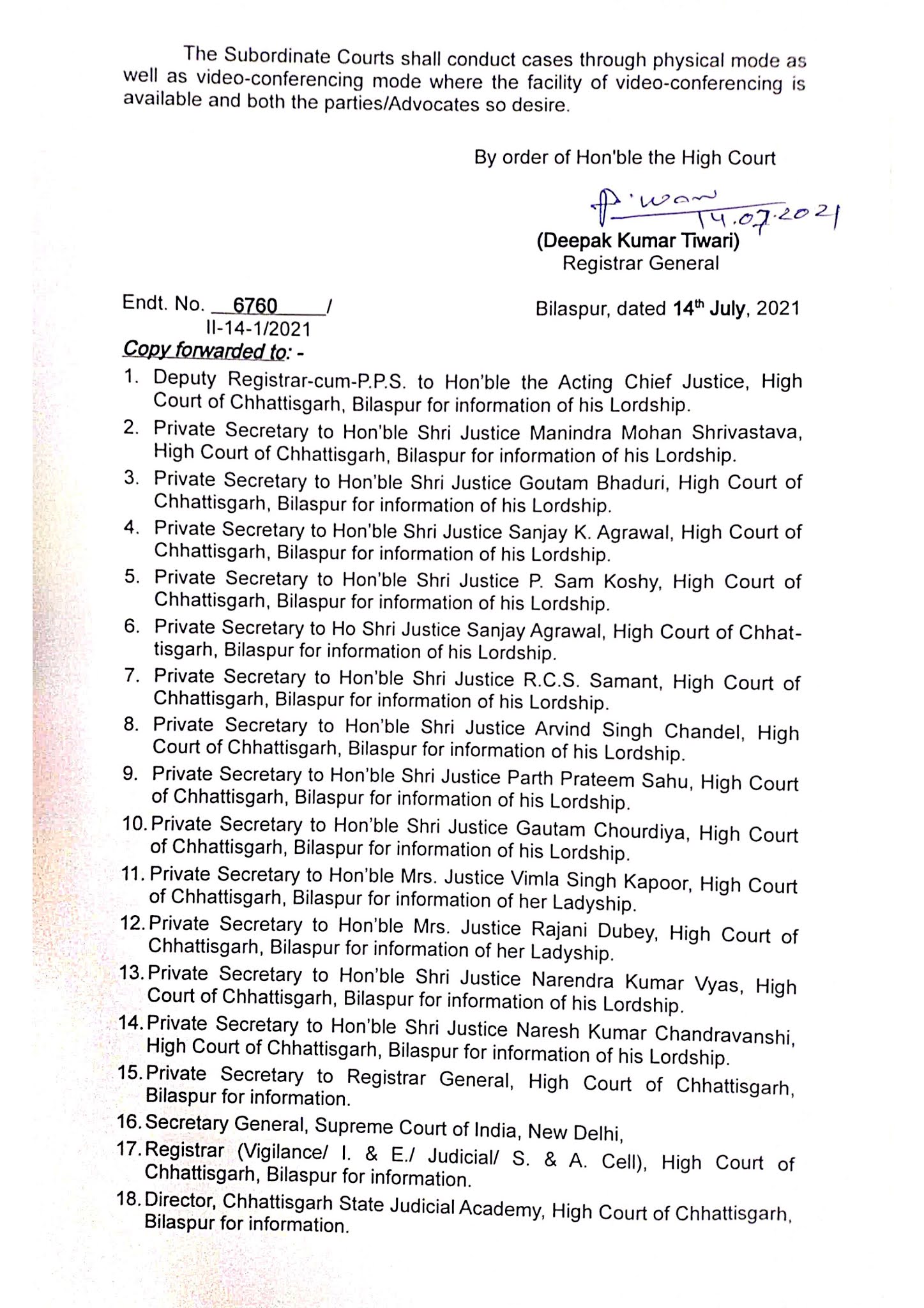 बिलासपुर। छत्तीसगढ़ हाइकोर्ट ने 19 जुलाई 2021 से सभी न्यायालयों में मामलों की नियमित सुनवाई का आदेश जारी किया है, जिससे अब छत्तीसगढ़ के सभी अधीन्सथ न्यायालयों में मामलों की नियमित सुनवाई शुरू होगी। गौरतलब हैं कि, न्यायालयों में नियमित कार्य न होने के कारण वकीलों को बहुत परेशानी को हो रहीं हैं, लेकिन अब हाइकोर्ट का यह आदेश वकीलों के लिए खुशखबरी से कम नही हैं।