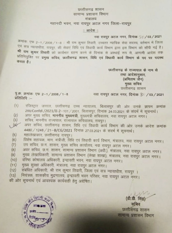 रायपुर (अधिवक्ता वाणी) न्यायिक सेवा में लम्बे समय से अपनी सेवाएँ दे रहे और वर्तमान में रायपुर जिला न्यायालय में वर्षो से पदस्थ जिला एवं सत्र न्यायाधीश राम कुमार तिवारी को छत्तीसगढ़ सरकार ने बड़ी जिम्मेदारी देते हुए विधि व विधायी कार्य विभाग, छ.ग. शासन के प्रमुख सचिव के पद पर नियुक्त किया है। सामान्य प्रशासन विभाग के सचिव डीडी सिंह ने यह आदेश जारी किया। जिसमें प्रतिनियुक्ति पर, उन्हे अस्थायी रूप से आगामी आदेश तक विधि व विधायी कार्य विभाग, छ.ग. शासन के प्रमुख सचिव के पद पर नियुक्त किया गया है।