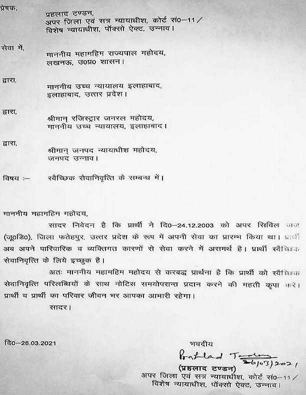 शुक्रवार सुबह जज प्रहलाद टंडन ने राज्यपाल, इलाहाबाद हाई कोर्ट के रजिस्ट्रार और जिला जज को एक चिट्ठी भेजी।जिसमें उन्होंने लिखा कि पारिवारिक और व्यक्तिगत कारणों से वह सेवा करने में असमर्थ हैं। व स्वैच्छिक सेवानिवृत्ति चाहते है।