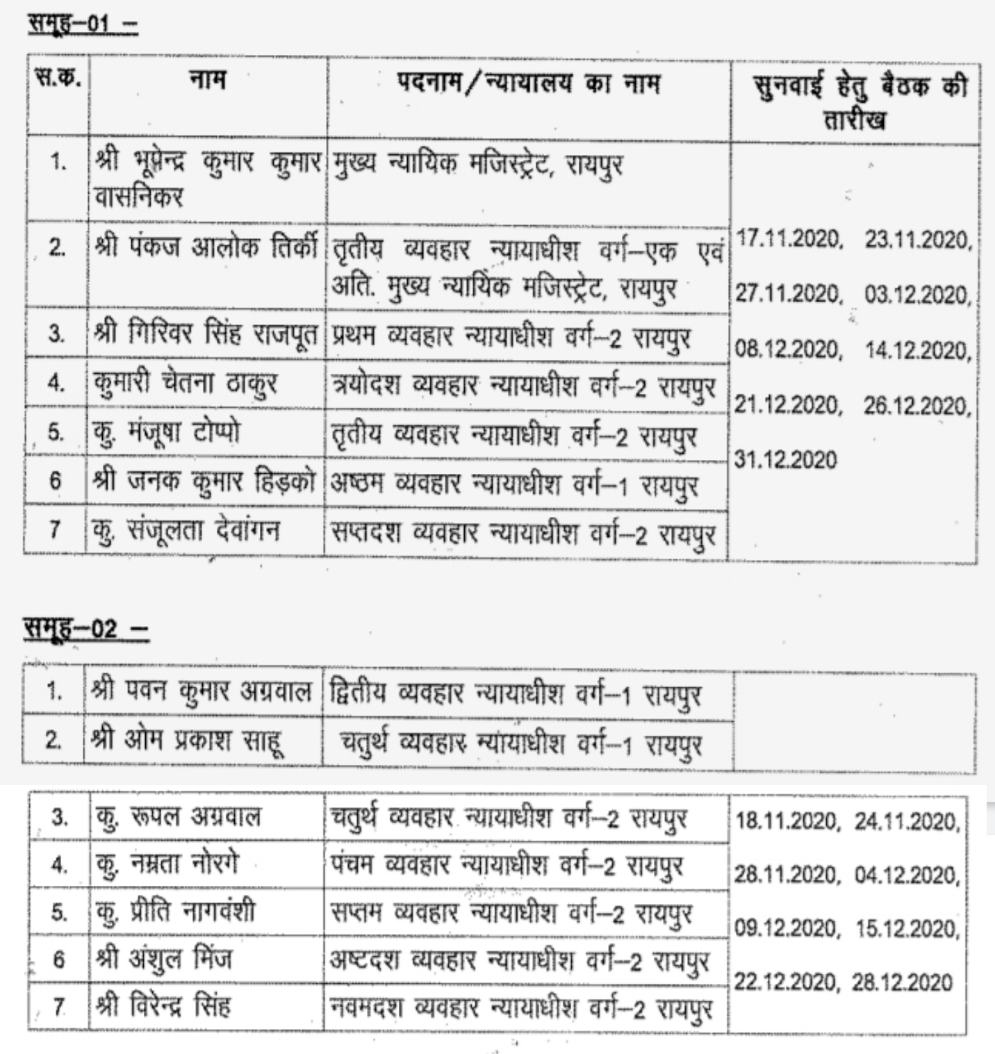 रायपुर। मार्च से स्थगित नियमित न्यायालयीन कार्य 17 नवंबर से शुरू होने की संभावना है। जिला एवं सत्र न्यायालय रायपुर में कौन से सिविल न्यायाधीश किस दिन पीठासीन होंगे इस संबंध में जिला एवं सत्र न्यायाधीश राम कुमार तिवारी ने आदेश जारी किया है और सिविल न्यायाधीशों की सुनवाई हेतु बैठक की तारीखों को 4 समूह में बांटा गया था। जिसमें 2 नामों में संशोधन किया गया है, जिसके अनुसार अब समूह 1 के सरल क्रमांक 4 से नीरज श्रीवास्तव, व्यवहार न्यायधीश, वर्ग 2 रायपुर का नाम विलोपित कर उनकी जगह कुमारी चेतना ठाकुर ,व्यवहार न्यायधीश त्रयोदश , वर्ग 2 का नाम प्रतिस्थापित किया गया है। और समूह 4 के सरल क्रमांक 7 में नीरज श्रीवास्तव का नाम जोड़ा गया है। बाकी समूह सूची यथावत हैं।