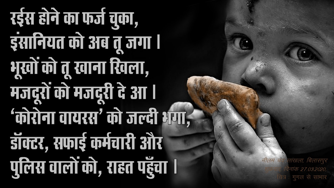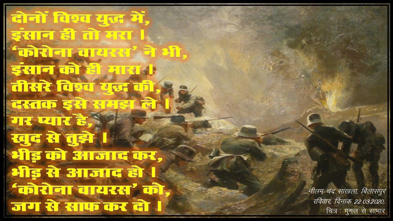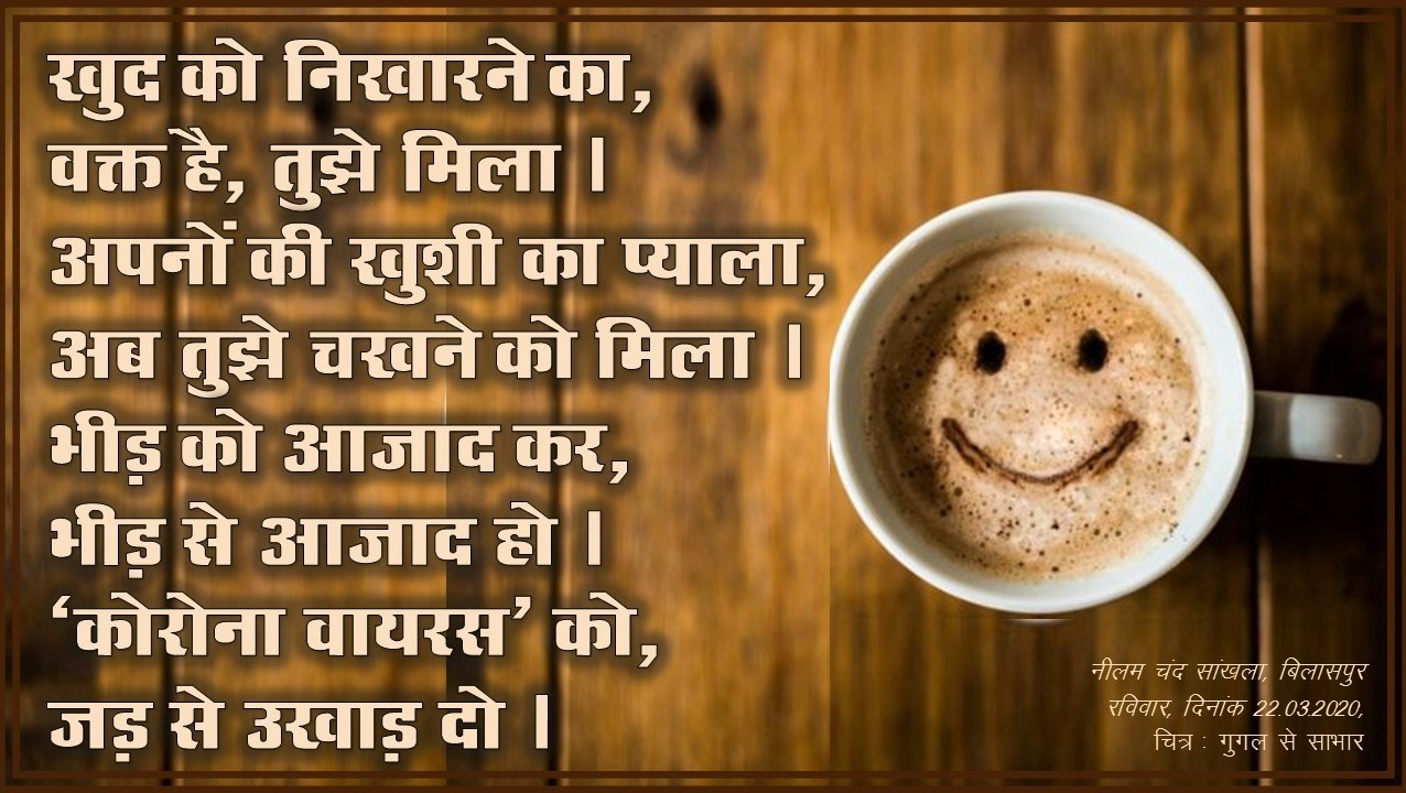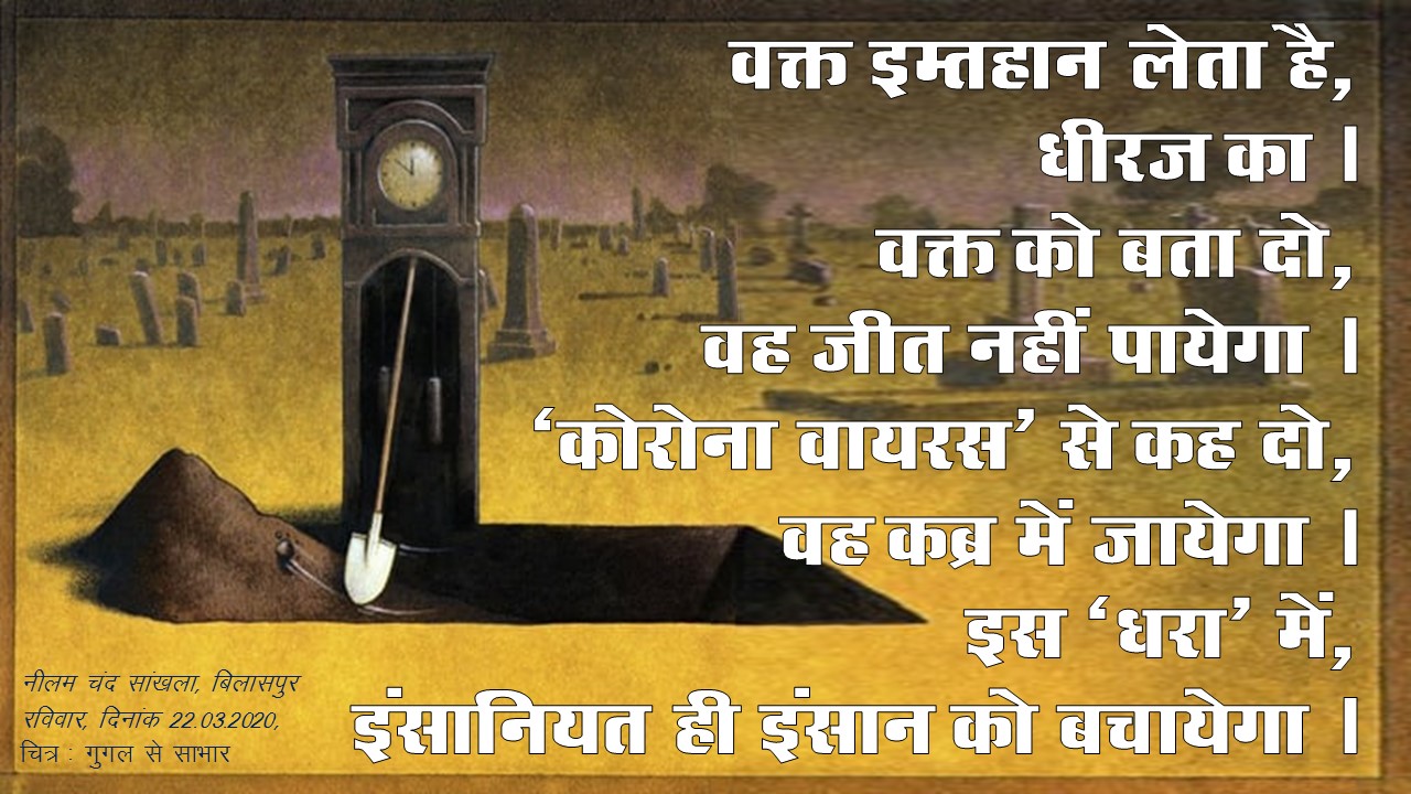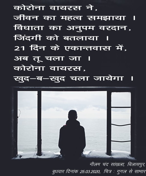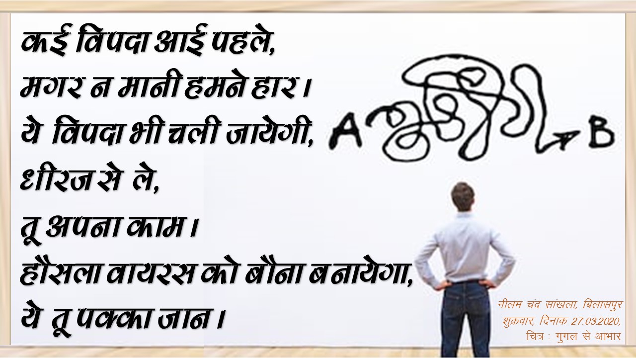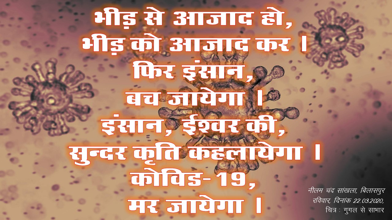 Uncategorized नीलम चंद सांखला जी द्वारा कोरोना जैसी भयंकर महामारी और लॉकडाउन पर कुछ पंक्तियां जो बिल्कुल सटीक बैठती हैं। ADHIVAKTA VANI April 3, 2020 नाम – नीलम चंद सांखला बिलासपुर प्रस्तुति — भरत सोनी (अधिवक्ता) रायपुर Continue Reading Previous: सुको ने होटलों को शेल्टर बनाने वाली याचिका ख़ारिज कर कहा,केंद्र को नही कर सकते बाध्यNext: SCBA : सदस्यों को 25 हजार का आर्थिक सहयोग Leave a Reply Cancel replyYour email address will not be published. Required fields are marked *Comment * Name * Email * Website Save my name, email, and website in this browser for the next time I comment. Δ Related Stories Uncategorized 60 year old woman got bail alleged projecting herself practising before the Supreme Court adhivaktavani777@gmail.com February 8, 2026 Uncategorized NI Act | Managing Director who signed Cheques and ran Daily Operations liable under Section 141 adhivaktavani777@gmail.com February 8, 2026 RAIPUR Uncategorized छत्तीसगढ़ CG: गृहमंत्री विजय शर्मा बोले- नक्सलियों को मिलेगा मुंहतोड़ जवाब ADHIVAKTA VANI February 5, 2026